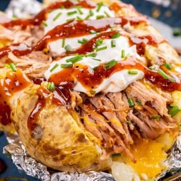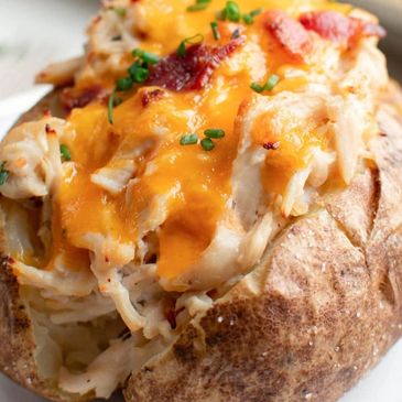 1 pound Baked Potato, Butter Added, Melted Cheddar Cheese, Pulled Pork, Sour Cream, Chives, & Crumbled Bacon